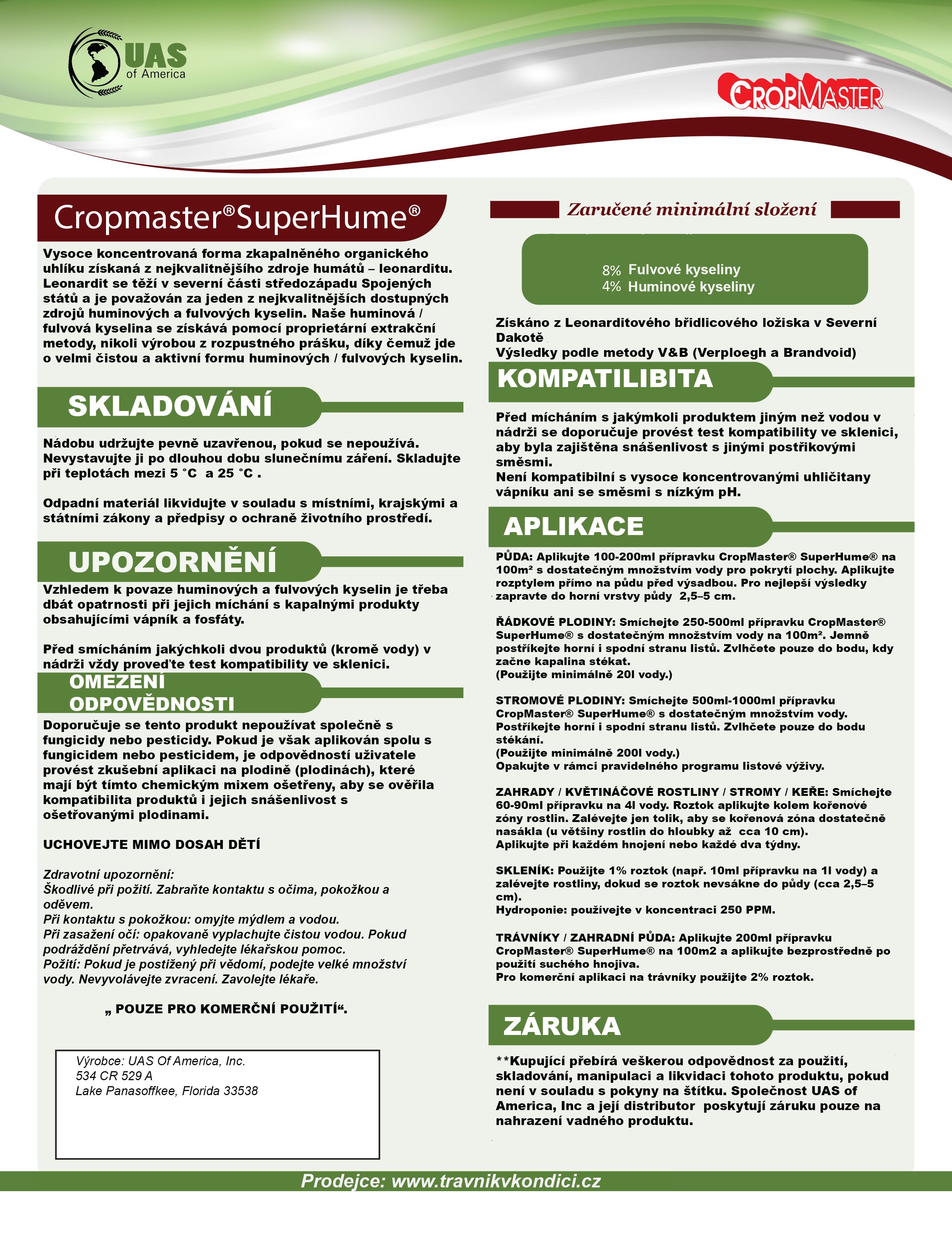 ŘÁDKOVÉ PLODINY: Smíchejte 250-500ml přípravku CropMaster® SuperHume® s dostatečným množstvím vody na 100m². Jemně postříkejte horní i spodní stranu listů. Zvlhčete pouze do bodu, kdy začne kapalina stékat.